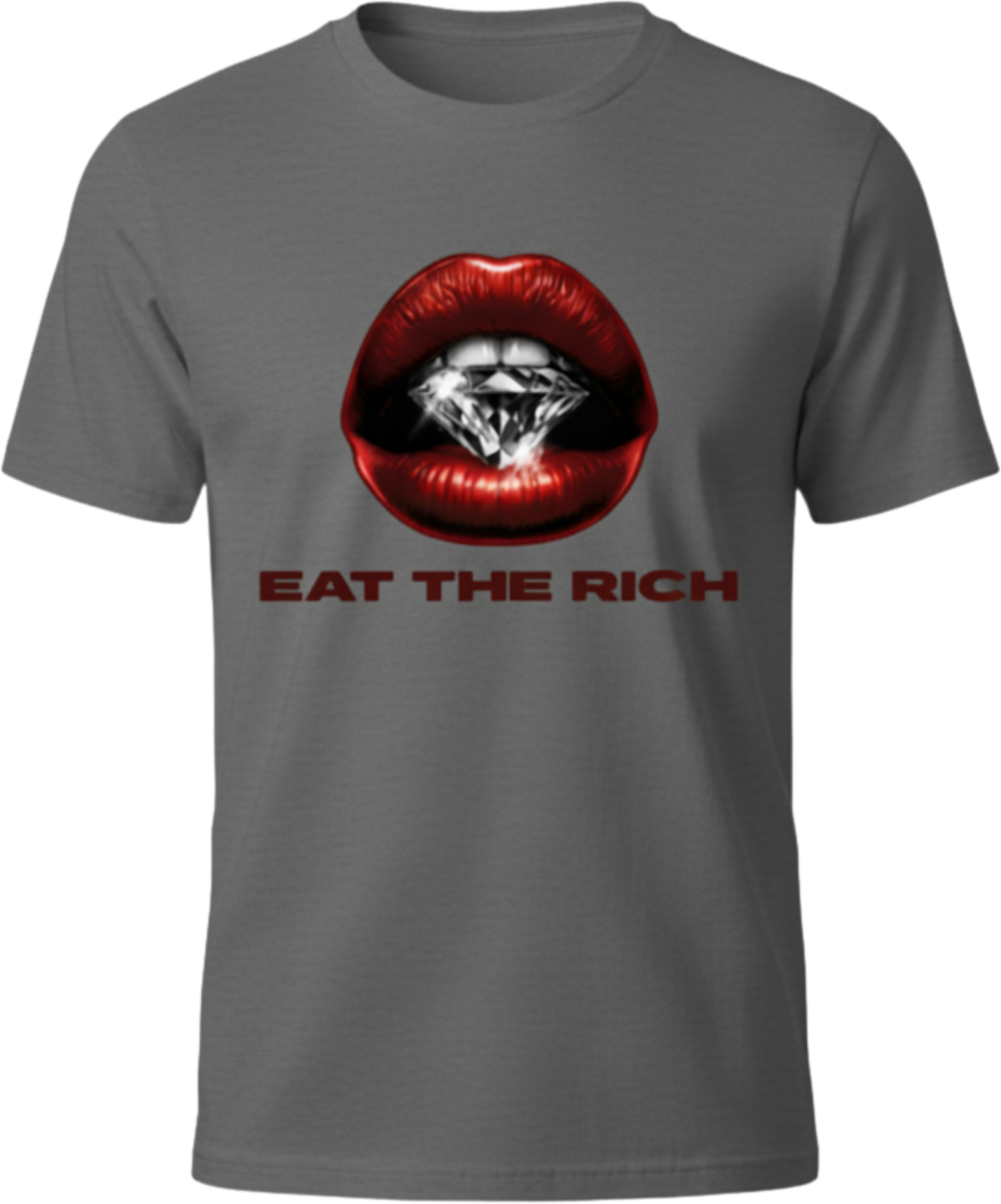 This tee features glossy red lips clamping down on a diamond like a warning shot, with the phrase EAT THE RICH underneath. It’s edgy, rebellious, and absolutely refuses to whisper.